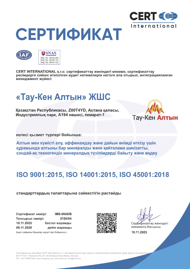 2022 жылы «Тау-Кен Алтын» ЖШС-де халықаралық талаптарға сәйкес келетін интеграцияланған менеджмент жүйесі (ИМЖ) енгізілді, ол халықаралық (ISO 9001:2015, ISO 14001:2015 и ISO 45001:2018.) стандарттар талаптарына сәйкестік сертификаттарына сәйкес сыртқы сертификаттық аудитпен расталды.